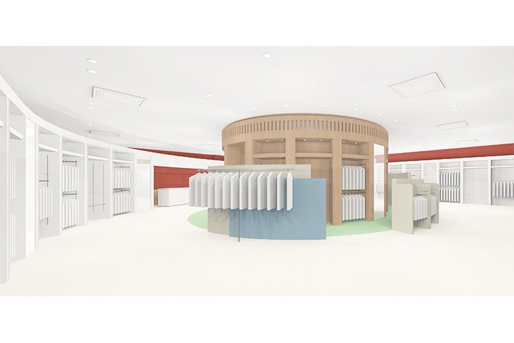どのフロアからもアクセスしやすい店舗中央に、円柱状のフォルムが印象的な4つのフィッティングルームを設けたほか、ラウンドさせた内壁で店舗全体を包むことで、お客様がリラックスしながら洋服選びを楽しめる空間をつくりました。「ビームス アウトレット ふかや花園」で展開するアイテムは、メンズ・ウィメンズのカジュアルウエア、ビジネスウエア、キッズ、雑貨などで、店舗奥にある大型のフィッティングルームでは、友人同士でそれら豊富なアイテムの試着を楽しんだり、ご家族が小さなお子様らと一緒に、広々とご利用いただくことも可能です。