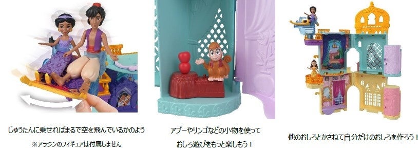 【Point】 ✓まるで映画の世界から飛び出してきたかのようなプレイセット、かさねるおしろシリーズより、 ディズニー・アニメーション『アラジン』からジャスミンのおしろが登場! 空飛ぶじゅうたんに、ジャスミンのドールを乗せて映画の世界観を再現しよう! ✓ ディズニーキャラクターのおしろでの日常をイメージしたかわいい動画も必見!