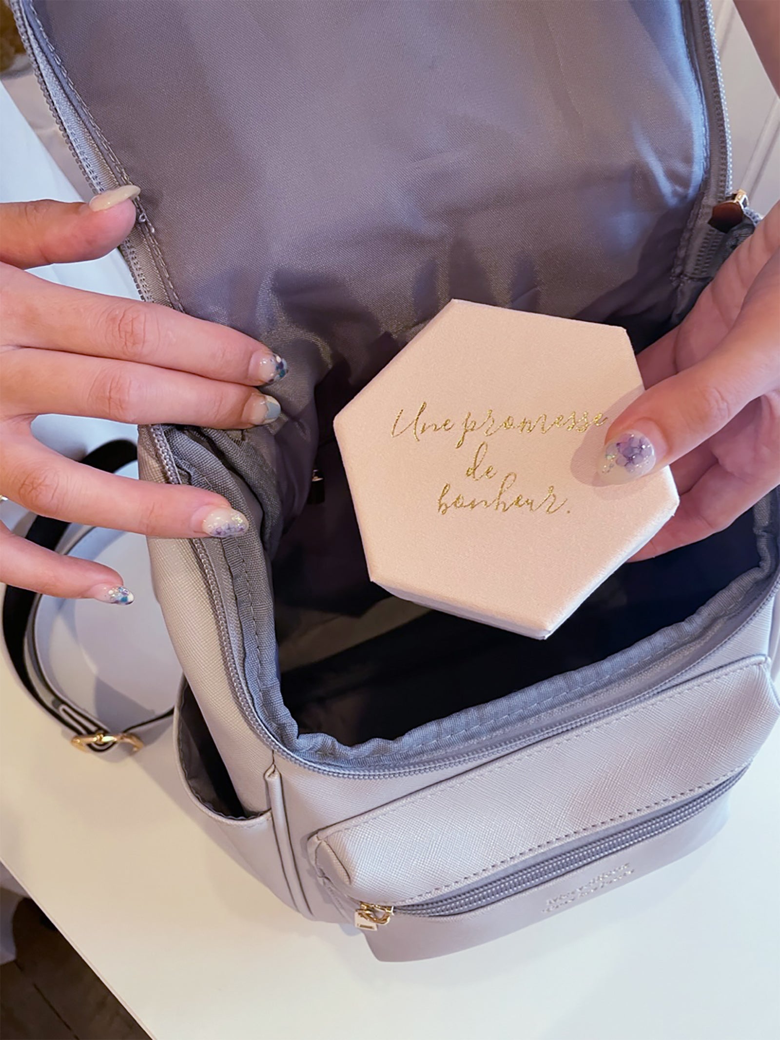 6角形の形状が特徴的なBOXは、まるでスウェードのような優しい手ざわり。蓋には「Une promesse de bonheur.」(幸せの約束)というフランス語が刻印されています。