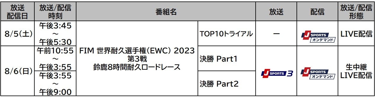 また8月5日(土)、 8月6日(日)は、「鈴鹿8時間耐久ロードレース」だけでなく、「SUPER GT 2023 第4戦 富士スピードウェイ」、「WRC世界ラリー選手権2023 第9戦 ラリー・フィンランド」も生中継/LIVE配信でお届けします。国内外のモータースポーツを圧倒的なボリュームでお届けするJ SPORTSにぜひご期待ください。