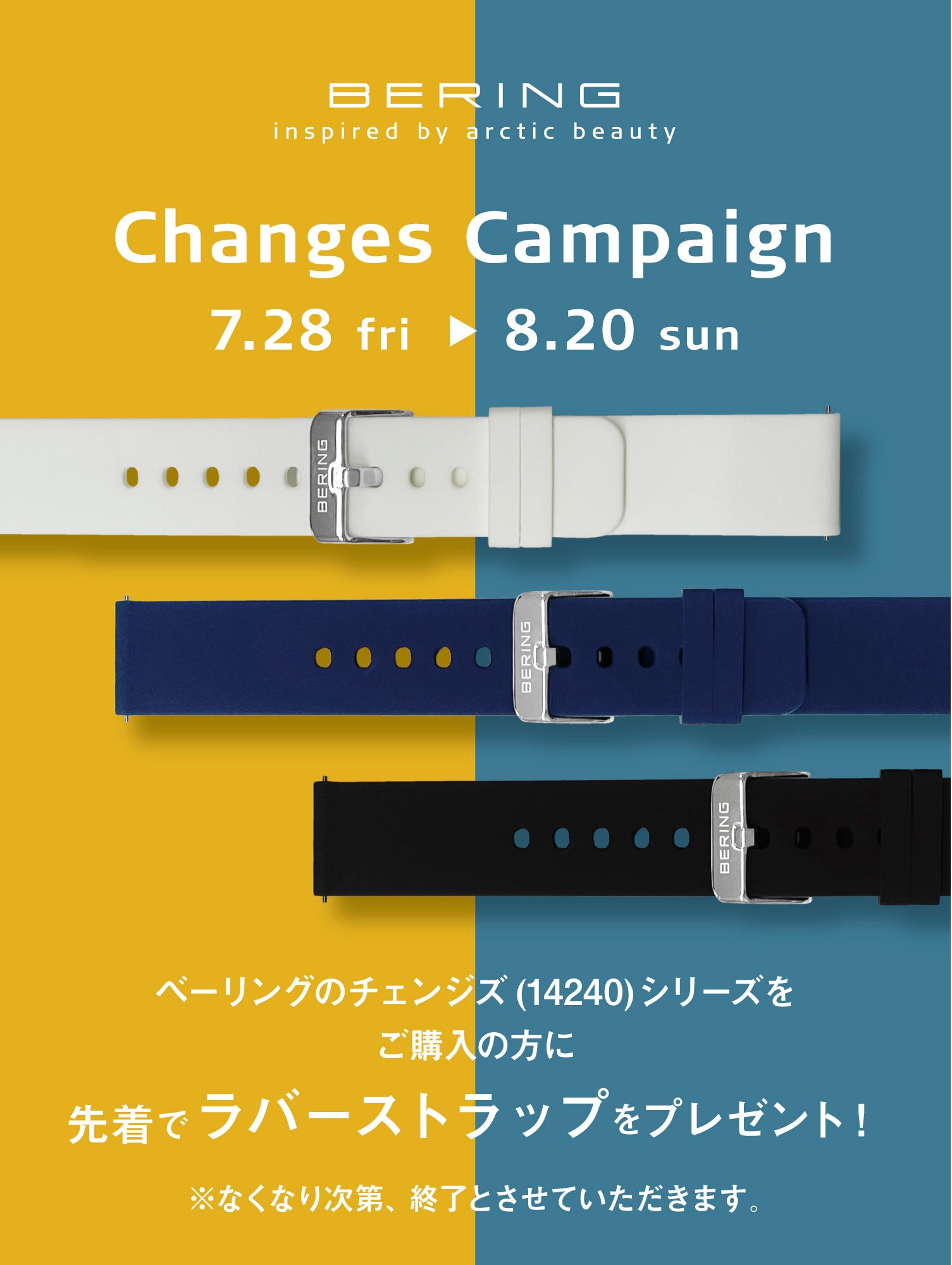 開催内容:期間中、対象店舗でBERING「Changes」のユニセックスモデル(14240)の腕時計をご購入の方に先着でラバーストラップを1本プレゼント。