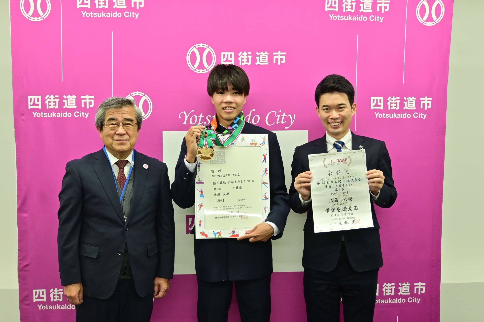 令和6年10月に開催された「国民スポーツ大会」及び「JOCジュニアオリンピックカップ第55回U16陸上大会」に四街道北中学校3年の後藤 大樹さんが出場しました。その結果報告のため後藤さんが四街道市長を表敬訪問しました。