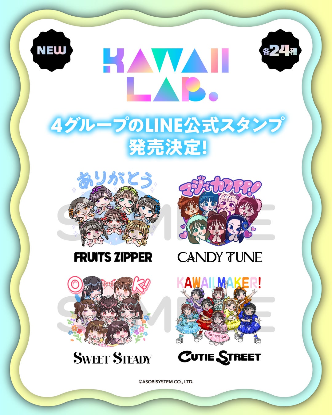 アイドルプロジェクトKAWAII LAB.に所属する、FRUITS ZIPPER、CANDY TUNE、SWEET STEADY、CUTIE STREETのボイス付きLINEスタンプが2025年5月29日(木)11:00より配信開始された。