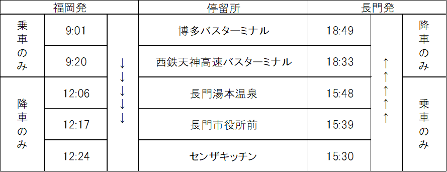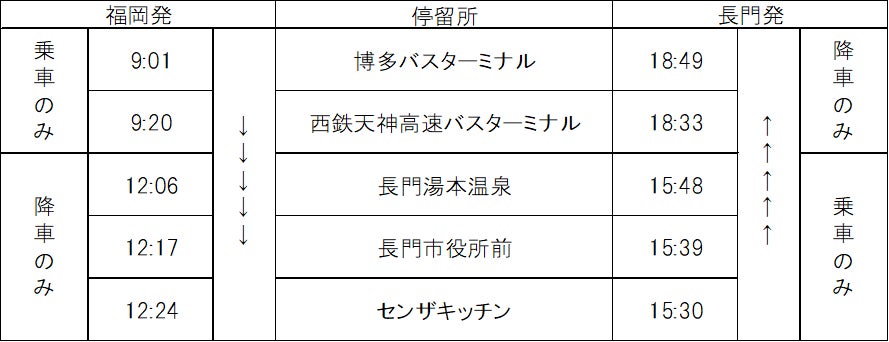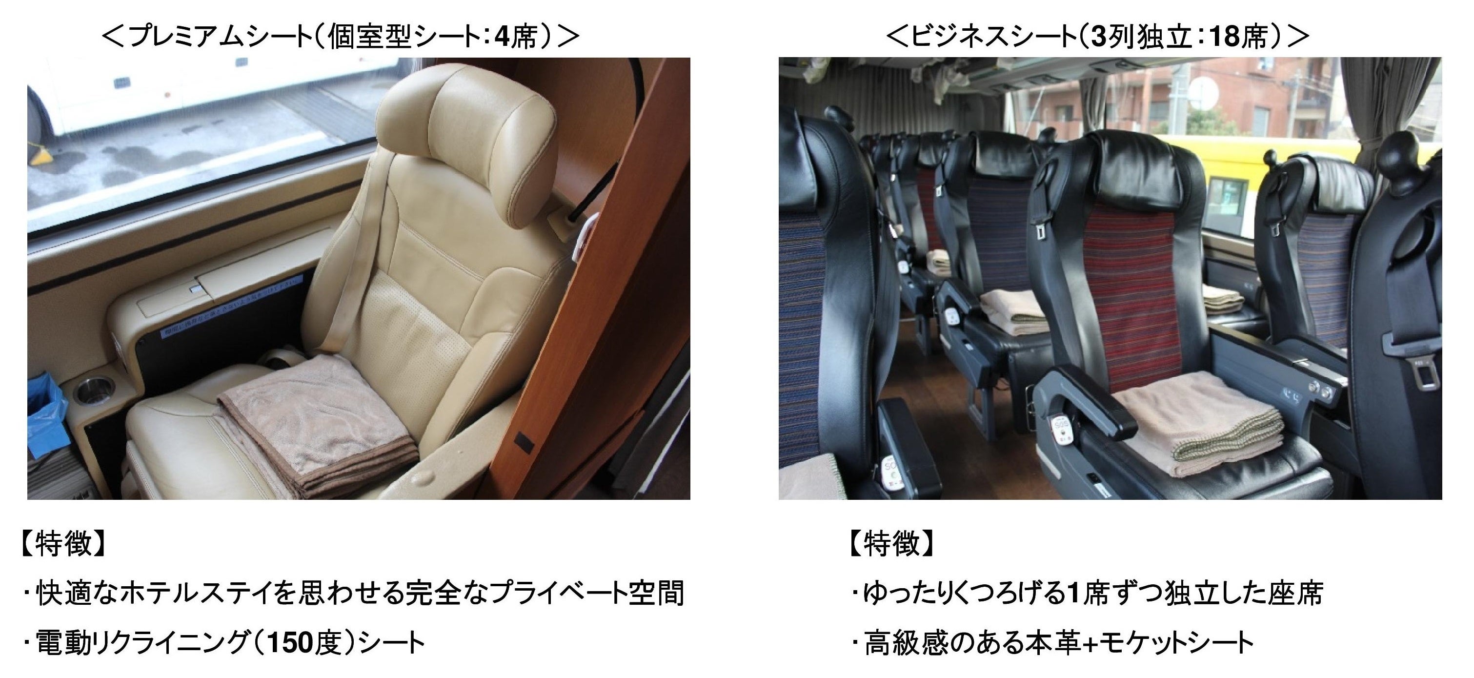 2022年7月に運行を開始したおとずれ号は、福岡(天神)と長門湯本温泉を片道約2時間45分で結ぶ高速バス路線です。通常は4列シート(40席)の車両で運行しておりますが、今回使用するはかた号の車両は、1席ずつ独立した横3列の“ビジネスシート”(18席)に加え、はかた号にしかない個室の“プレミアムシート”(4席)を配置した特別仕様となっており、目的地までゆったりとおくつろぎいただけます。