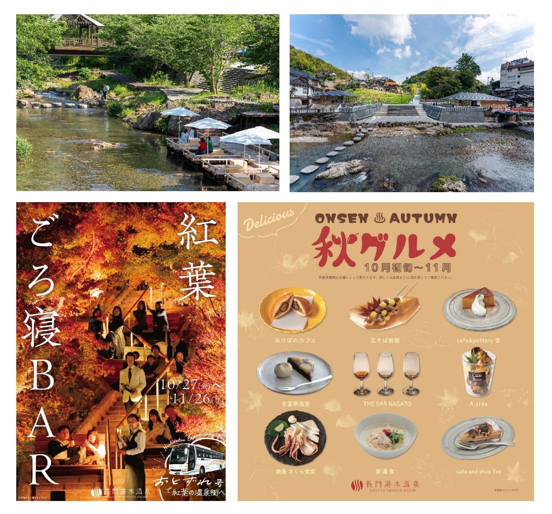 長門湯本温泉は、約600年の歴史をもつ山口県最古の温泉街で、中心部を流れる音信川(おとずれがわ)に沿ってたくさんの魅力が散りばめられています。近郊には元乃隅(もとのすみ)神社や角島(つのしま)など、知名度の高い観光地があり、旅の拠点としても最適です。また、10月27日から11月26日までの期間中、温泉街の中心に位置する「紅葉の階段」において、お酒を飲みながら美しく色づく紅葉を楽しめるイベント「紅葉ごろ寝BAR」も開催される予定です。