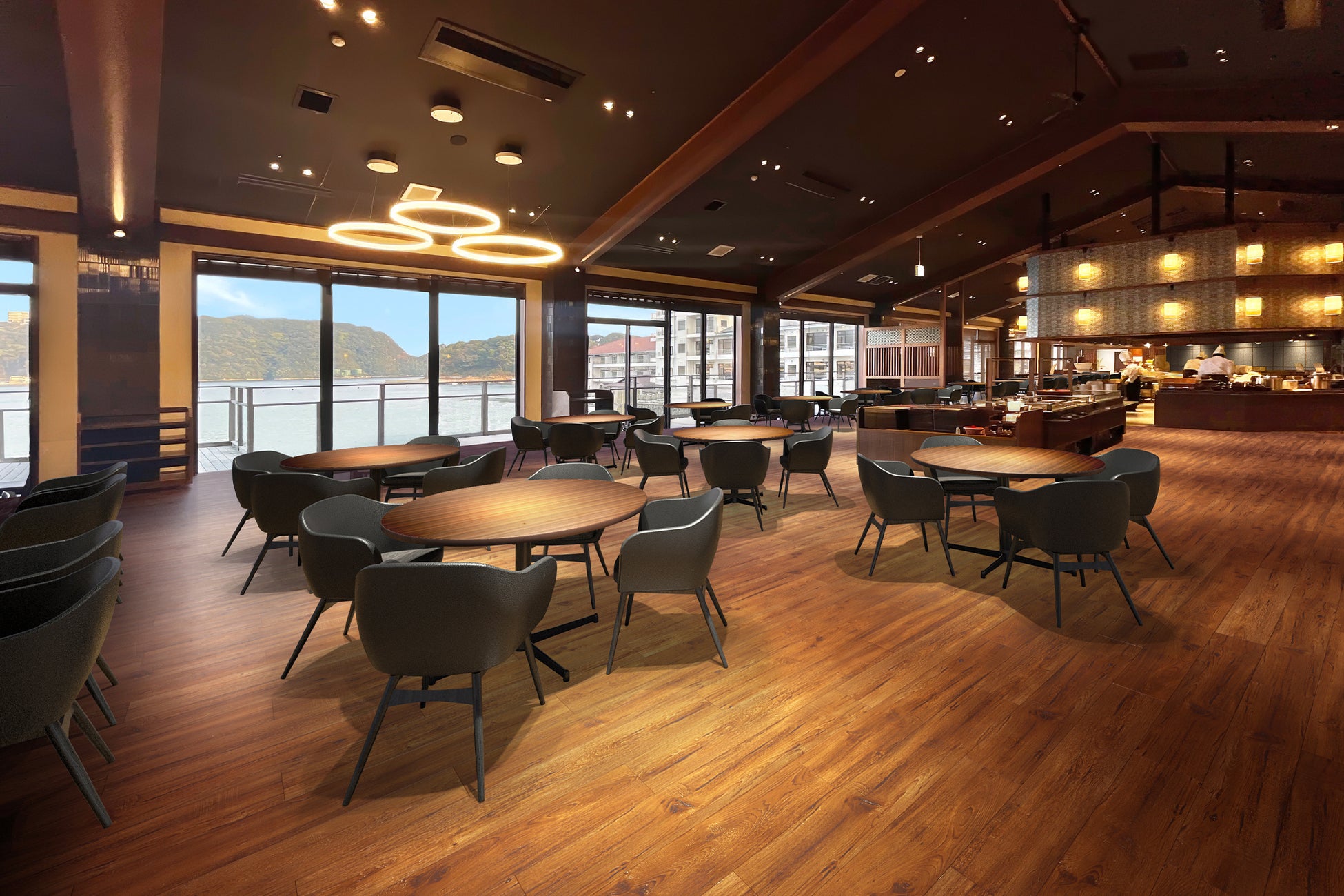 「ゆったりと、たおやかに。」お食事を楽しんでいただけるよう、各テーブルの間隔にゆとりを持たせ、今まで以上にゆったりと食事をお楽しみいただけるようにリニューアル。夕食バイキングでは、那智勝浦町の勝浦漁港で水揚げされた生まぐろのお造りや握り寿司など、ご当地の海の幸を思う存分ご堪能いただけます。また、夕食時のアルコールはすべて飲み放題となっておりますので、お好みのお酒とお料理のペアリングを楽しむのもおすすめです。