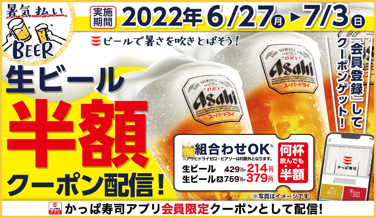 コロワイドグループのかっぱ寿司(カッパ・クリエイト㈱ 本社:神奈川県横浜市)は、2022年6月27日(月)~7月3日(日)の期間、かっぱ寿司で利用できる「生ビール半額クーポン」をかっぱ寿司アプリ会員様に配信いたします。