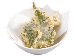 ネタをだし醤油・生姜・大葉と一緒によくたたき、大葉で挟み天ぷらにした一品。「天つゆ」はもちろん、卓上にある「お塩」や「甘だれ」をかけて召し上がるのもおすすめです