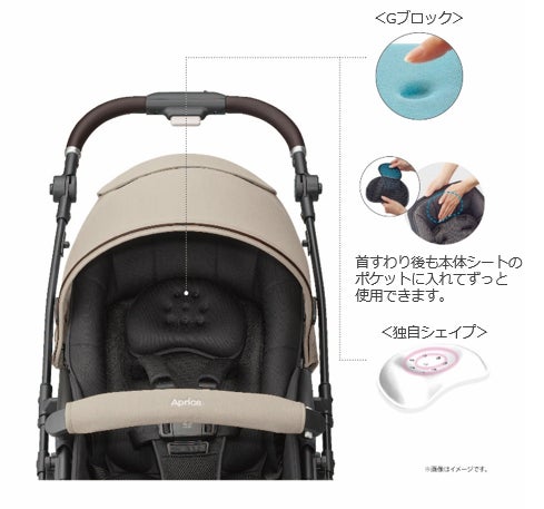 衝撃吸収材の「Gブロック」内蔵で、赤ちゃんの頭部に伝わる衝撃を吸収します。