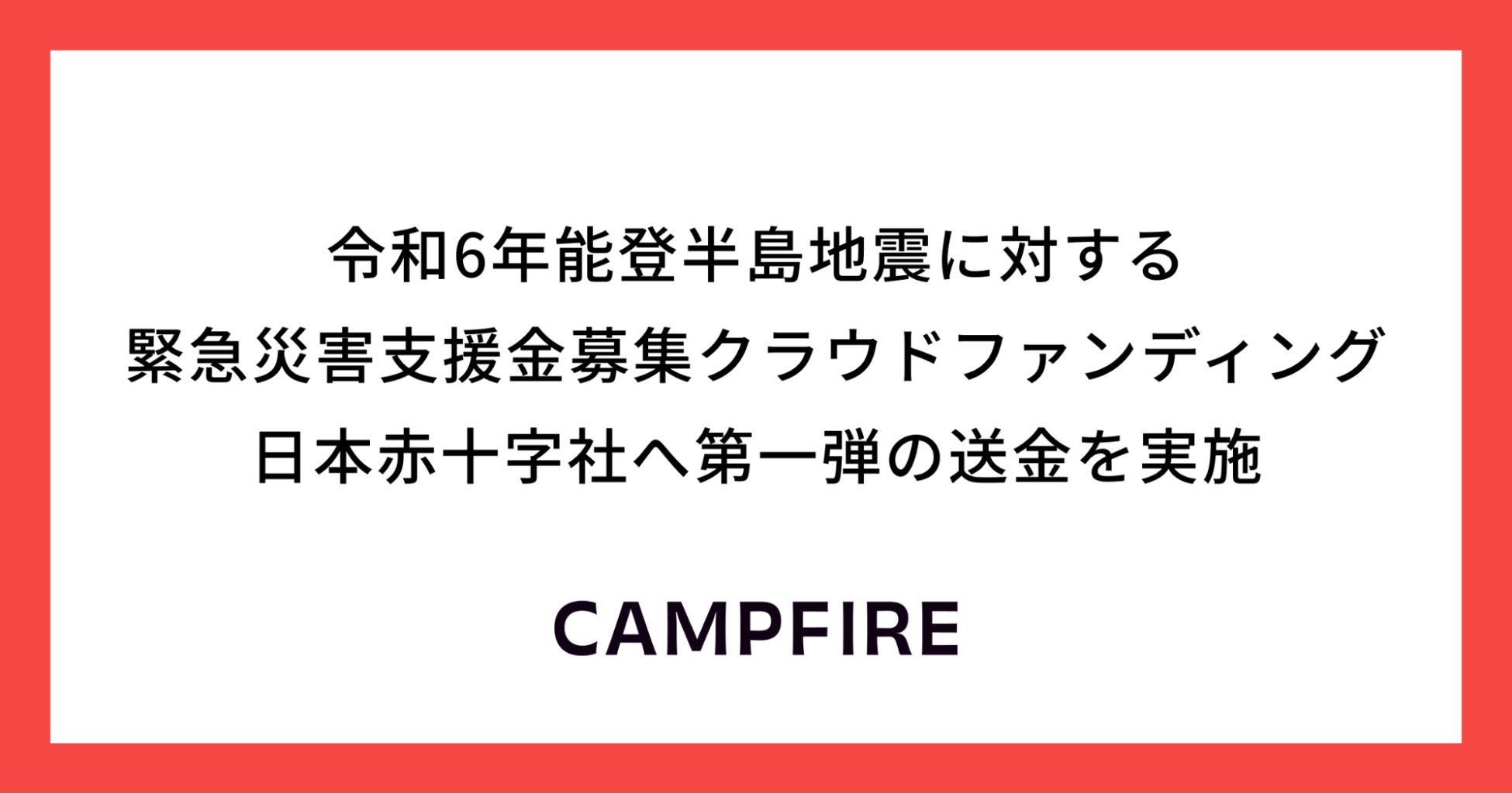 CAMPFIREは発災翌日の1月2日に緊急災害支援金の募集のクラウドファンディングを開始し、2月末までご支援を募集しております。通常はプロジェクト終了後に集まった支援金を送金しておりますが、被害の大きさを鑑みて、地域の皆さまへいち早く支援を届けるべく、2月8日(木)をもって本プロジェクトにおける支援金の一部にあたる20,492,599円を先んじて日本赤十字社の災害支援窓口に振込みました。