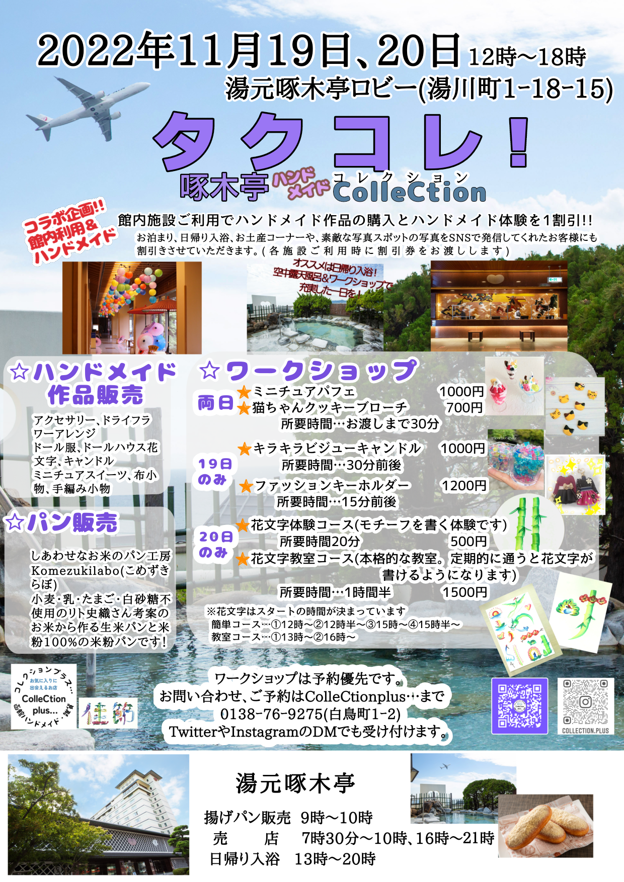 【函館湯の川温泉/湯元啄木亭】啄(たく)コレ開催【ハンドメイド作品販売×ワークショップ】