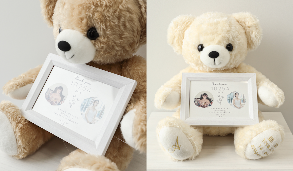 PLACOLE&DRESSYが運営する『DRESSY ONLINE』で大人気の体重ベア。今回新登場するのは、感謝状を手にもった結婚式での両親・家族への贈り物にぴったりな体重ベアです。感謝状は、花言葉に「感謝」の意味を持つお花のイラストが入ったオリジナルデザインで、写真や自由な文章を入れることができます。ふわふわの手触りで思わず頬ずりしたくなります。