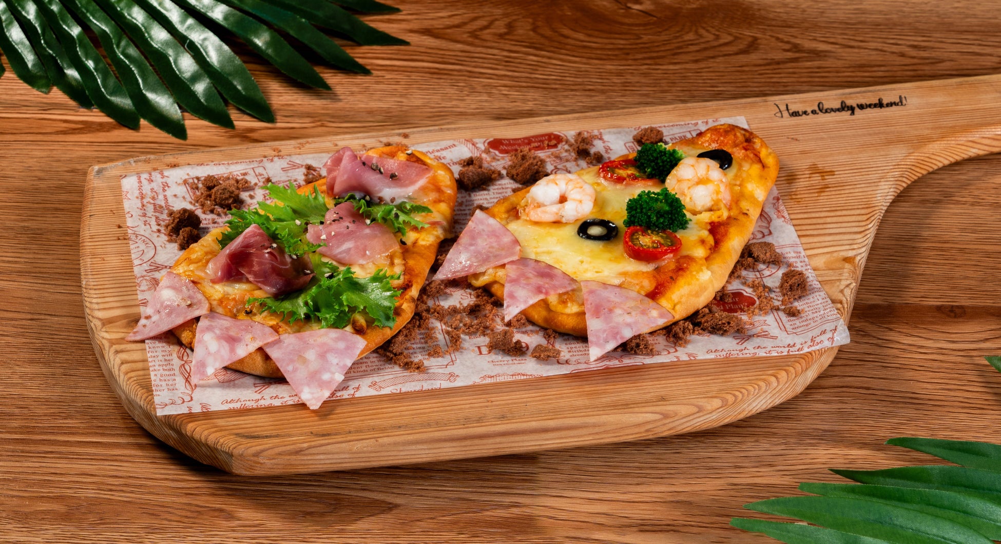 巨大な恐竜の足跡をイメージしたナンのピザ。