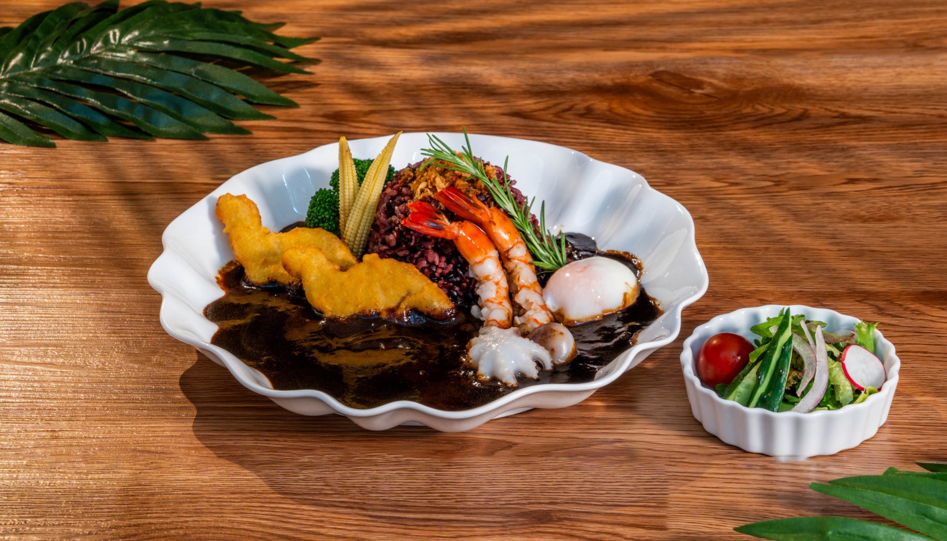 エビやイカの海の幸と恐竜チキンナゲット添えた味わい豊かな一品。