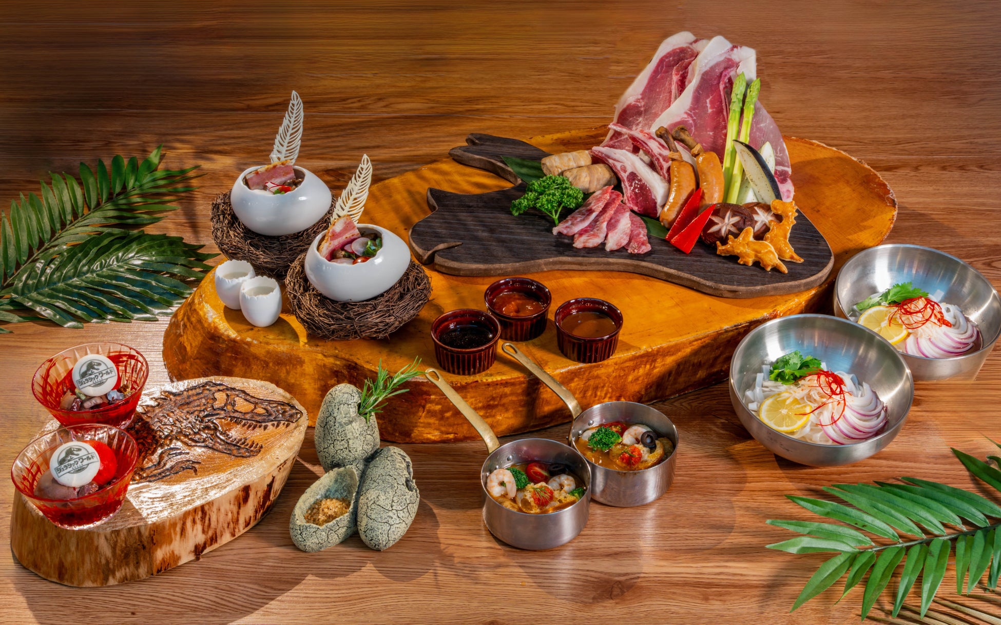 本映画のカギとなる“陸・海・空”をテーマとするBBQメニューは、肉感たっぷりのTボーンステーキ、国産牛カルビなどを5種の味付けで飽きることなくお楽しみいただけるほか、ジュラシック・エッグ・サラダをはじめフォトジェニックなお料理をご用意。アラカルトでは、ヨーグルトアイスとレモンソルベ、グレープフルーツの果肉入りの青いゼリーを合わせた“海”を連想させる夏らしいスイーツや、恐竜の巨大な足跡をイメージしたピザなど、こだわりのメニューが恐竜たちの世界へと誘います。