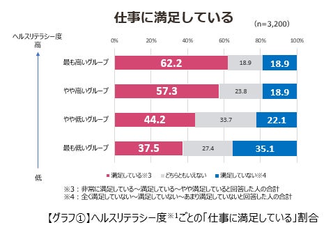 仕事に満足しているかどうかを質問したところ、ヘルスリテラシー度によって満足している割合に大きく差が出ることが分かりました。具体的には、ヘルスリテラシーが最も低いグループの「仕事に満足している」割合が37.5%に対し、ヘルスリテラシーが最も高いグループの割合が62.2%でした。(【グラフ①】)