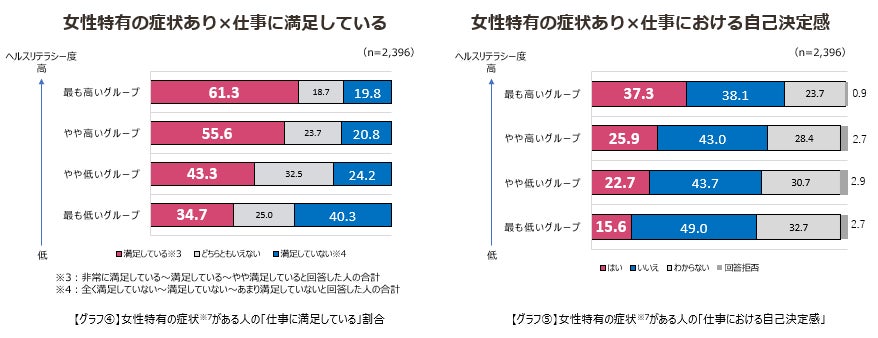 また、「女性特有の症状※7がある」 人において、ヘルスリテラシー度※1が高いほど仕事満足度、”はたらく”喜び・楽しみ、自己決定感がいずれも高いことが明らかになりました。女性の働き方とヘルスリテラシーに関する調査 vol.1 < https://www.persol-career.co.jp/pressroom/news/corporate/2022/20220310_01/ >において、女性特有の症状が理由で「働き方を変えたり、諦めたりしたことがある」女性が54.1%いることをお伝えしましたが、今回の調査結果から女性特有の症状があっても、ヘルスリテラシーを身につけることで仕事に対する満足度や”はたらく”喜び・楽しみが高められる可能性があることが分かりました。(【グラフ④⑤⑥】)