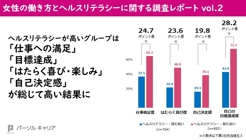 女性の働き方とヘルスリテラシーに関する調査 vol.2 ヘルスリテラシーが高い女性グループは「仕事への満足」「目標達成」「はたらく喜び・楽しみ」など、低いグループよりも高い結果に