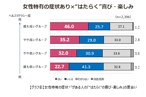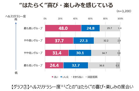 また、「“はたらく”喜び・楽しみを感じている※5」と回答した女性はヘルスリテラシーが最も高いグループで48.0%、最も低いグループで24.4%でした。(【グラフ③】)