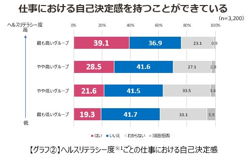 ヘルスリテラシーが最も高い女性グループの「仕事における自己決定感を持つことができている※5」割合は39.1%、最も低いグループの同割合は19.3%でした。(【グラフ②】)
