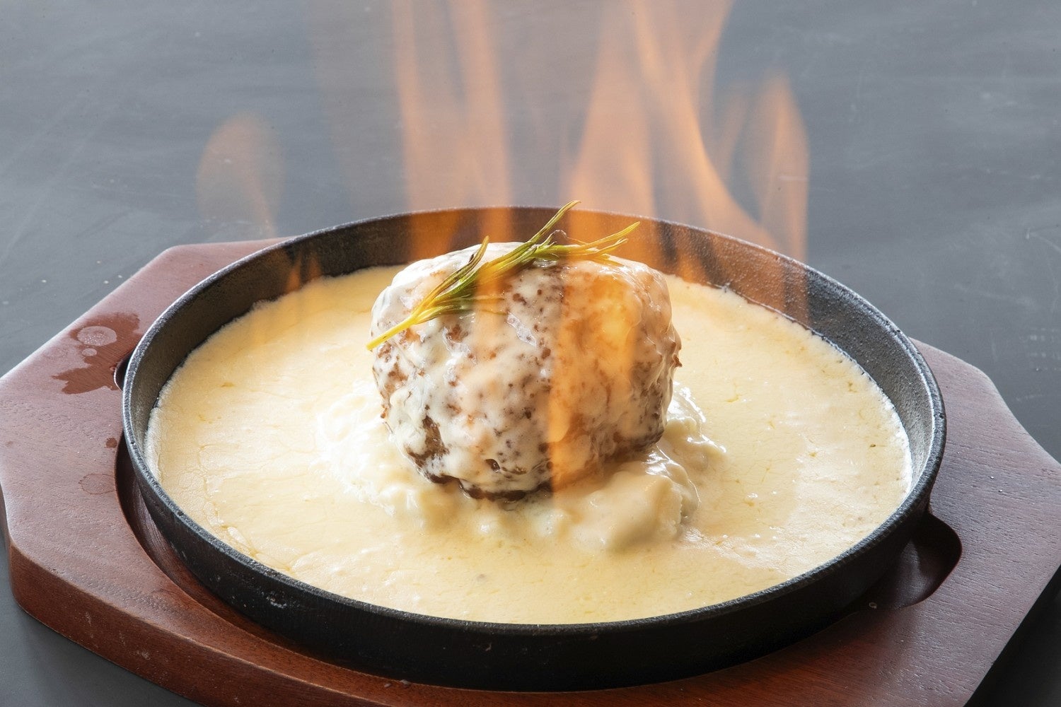 ハーフポンド(225g)の大サイズハンバーグに、ホワイトラクレットソースをたっぷりとかけて。さらに卓上でフランベし、炎の演出をお楽しみいただけます。