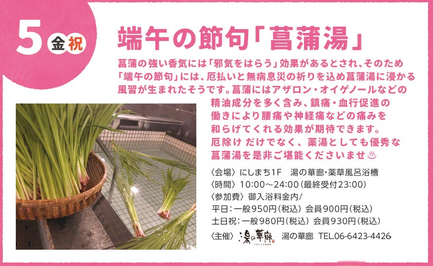 5月5日(金・祝) | こどもの日特別湯「菖蒲湯」 菖蒲の強い香気には「邪気をはらう」効果があるとされ、そのため「端午の節句」には、厄払いと無病息災の祈りを込め菖蒲湯に浸かる風習が生まれたそうです。菖蒲にはアザロン・オリゲノールなどの精油成分を多く含み、鎮痛・血行促進の働きにより腰痛や神経病などの痛みを和らげてくれる効果が期待できます。 |