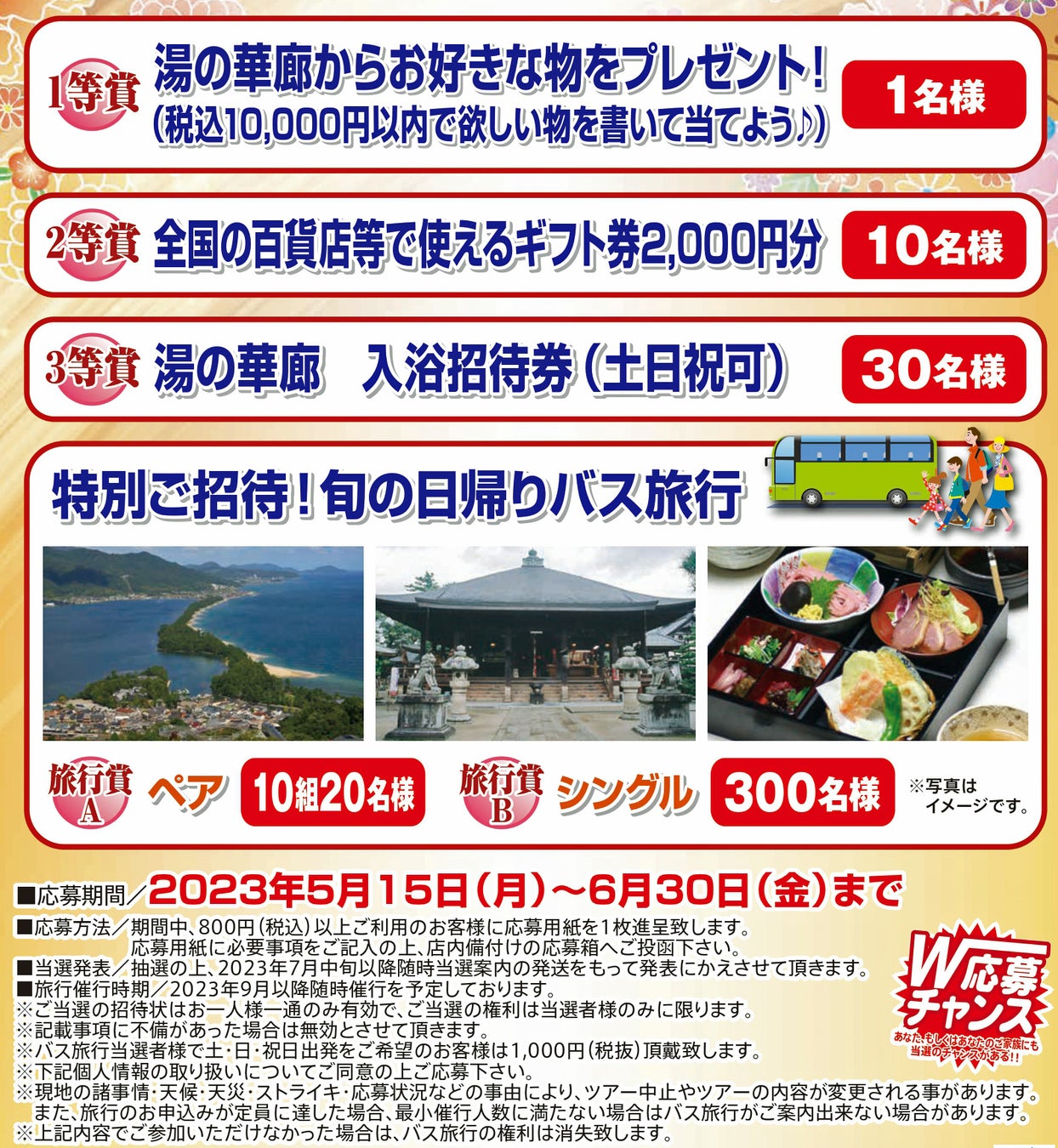 5月15日(月) ~6月30日(金) | 湯の華廊大感謝企画「湯ったりキャンペーン」 800円(税込)以上ご利用のお客さまに応募用紙を1枚進呈。ご応募いただいた中から抽選で、旬の日帰りバス旅行などが当たります。 ※当選は、発送をもってお知らせいたします。 |