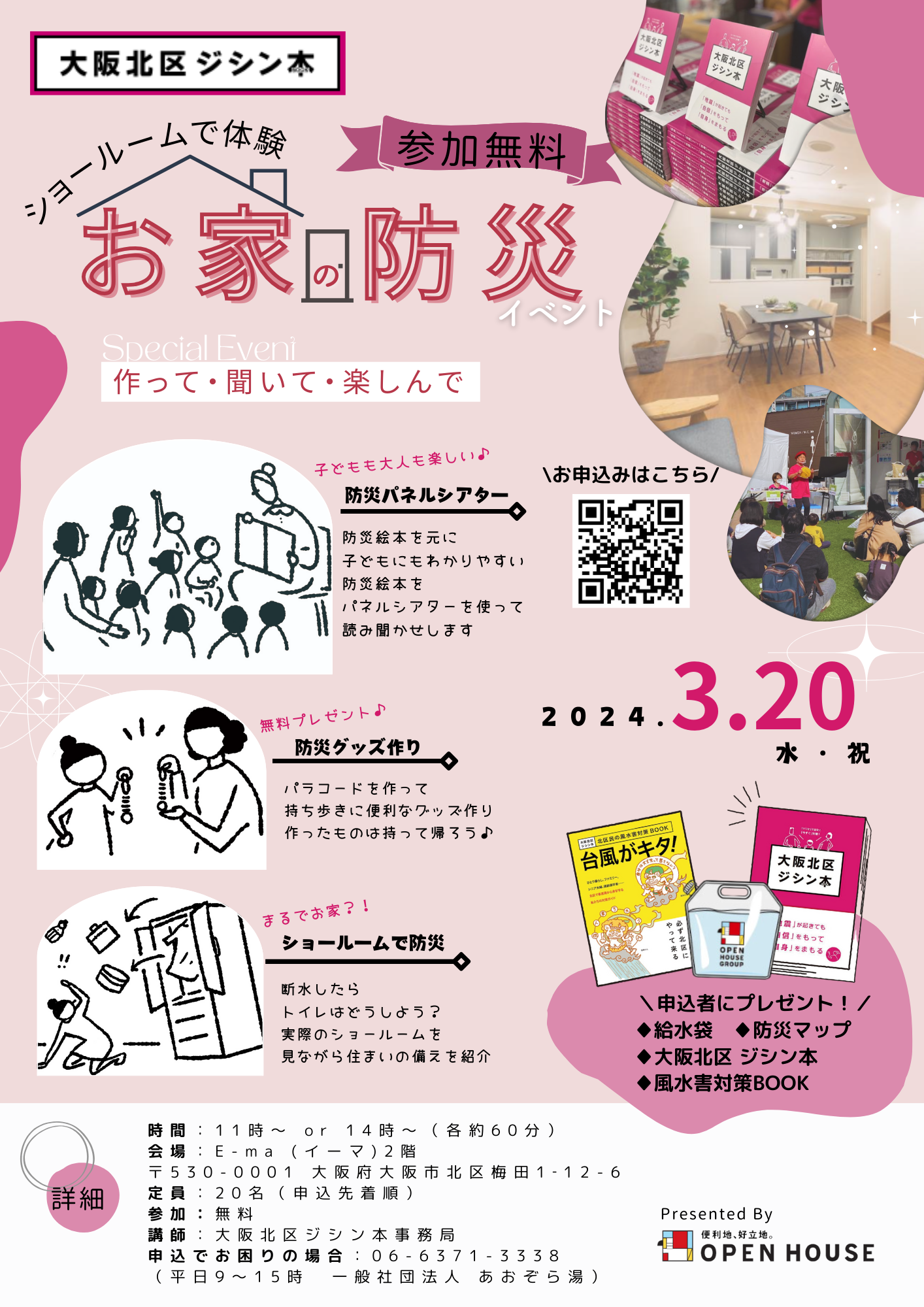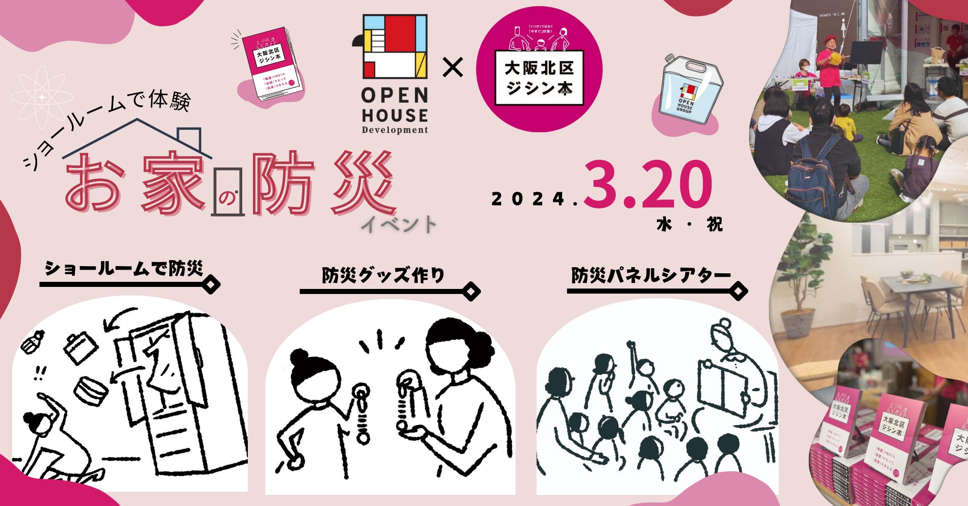 株式会社オープンハウスグループ(本社 東京都千代田区、代表取締役社長 荒井正昭)のグループ会社である株式会社オープンハウス・ディベロップメントの関西支社は、2024年3月20日(水)に大阪市北区の出張ジシン本イベント「ショールームで体験 お家の防災イベント」を大阪市北区 ジシン本事務局と協力して開催いたします。