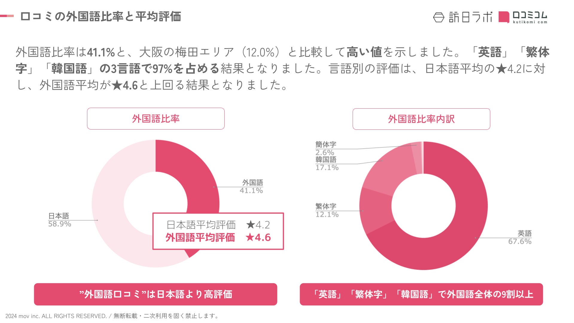 外国語比率は41.1%と、大阪の梅田エリア(12.0%)と比較して高い値を示しました。また「英語」「繁体字」「韓国語」の3言語で97%を占める結果となりました。