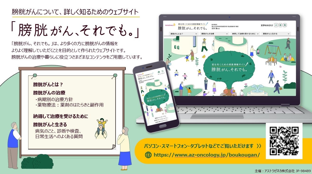 アストラゼネカでは、「膀胱がん、それでも」 https://www.az-oncology.jp/boukougan/を通じて、膀胱がんの疾患情報・治療についての分かりやすい説明に加え、疾患に関するよくある質問への回答等、患者さんに寄り添った情報を提供しています。膀胱がんのほかにも、さまざまながんの情報サイトを運営しています。がん全般(「がんになっても」 https://www.az-oncology.jp/)、肺がん(「肺がんとともに生きる」https://www.haigan-tomoni.jp/)、婦人科がん(「婦人科がん.jp」https://www.az-gynecologic-cancer.jp/)、前立腺がん(「What’s? 前立腺がん」https://www.zenritsusen.jp)、慢性リンパ性白血病(「CLLライフ」https://www.cll-life.jp/ )、肝臓がん(「肝臓がんと『自分らしく』」https://www.az-oncology.jp/kanzogan/)、胆道がん(「教えて、胆道がん」https://www.az-oncology.jp/tandogan/)、マントル細胞リンパ腫(「MCLライフ」(https://www.az-oncology.jp/mcl-life/)