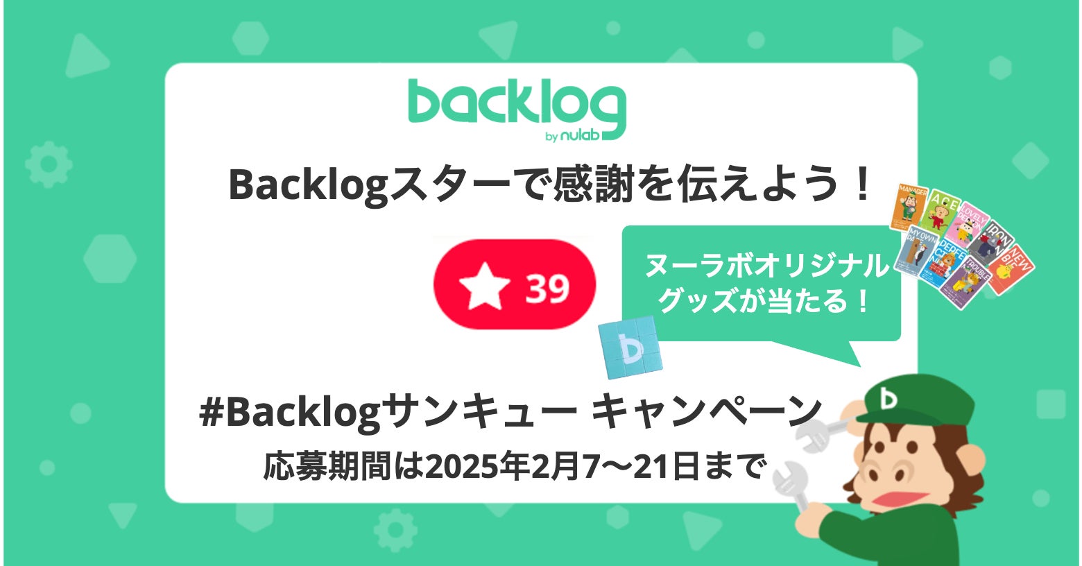 世界で140万人以上が利用するプロジェクト・タスク管理ツール「Backlog」を提供する株式会社ヌーラボ(本社:福岡県福岡市、以下 ヌーラボ)は、『“このチームで一緒に仕事できてよかった”を世界中に生み出していく。』を実現するため、チームで働く皆様の「ありがとう」を伝える文化醸成に寄与したいと考え、3月9日のサンキューの日に向けてX(旧Twitter)を使った「#Backlogサンキュー キャンペーン」を2025年2月7日(金)〜21日(金)に実施します。