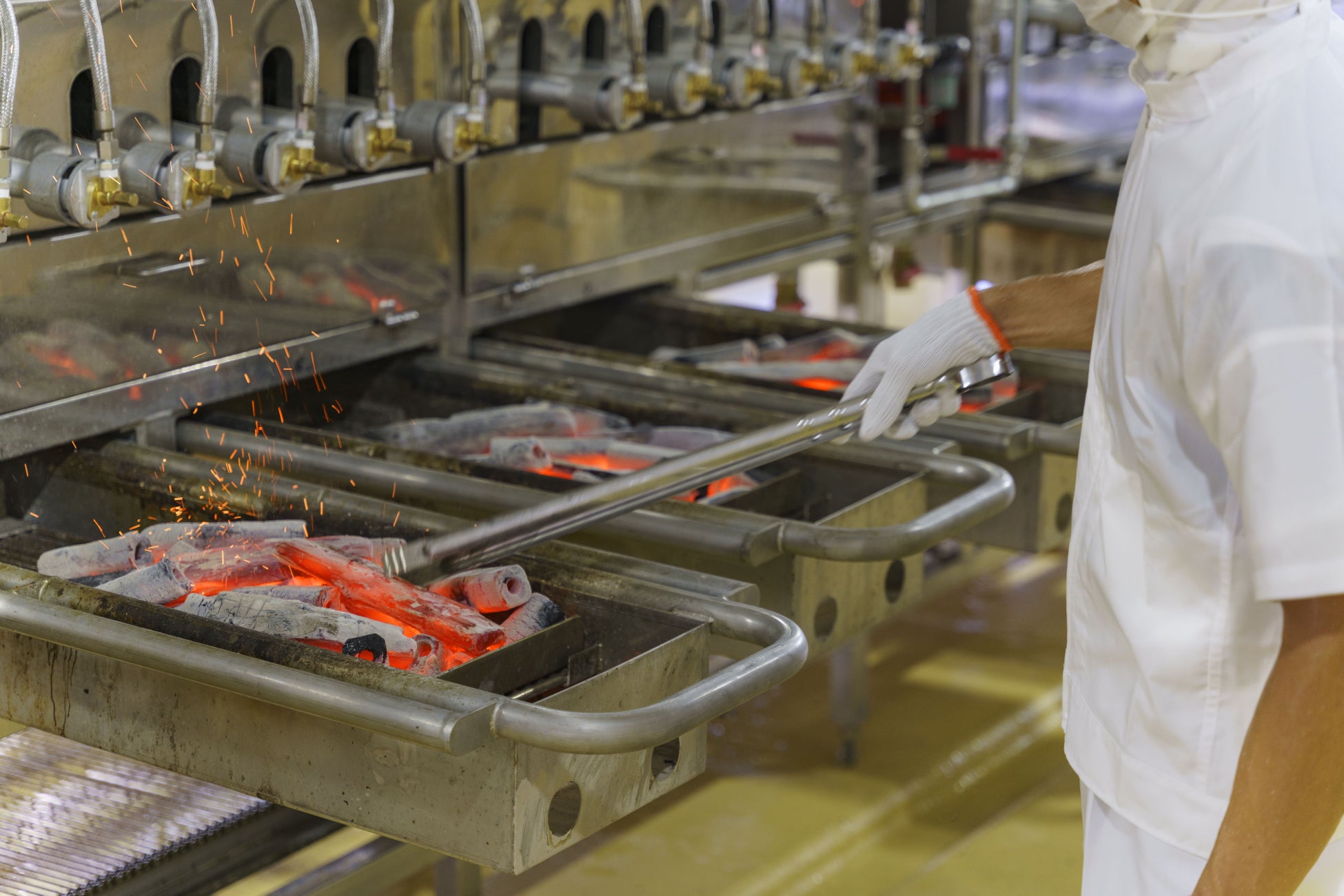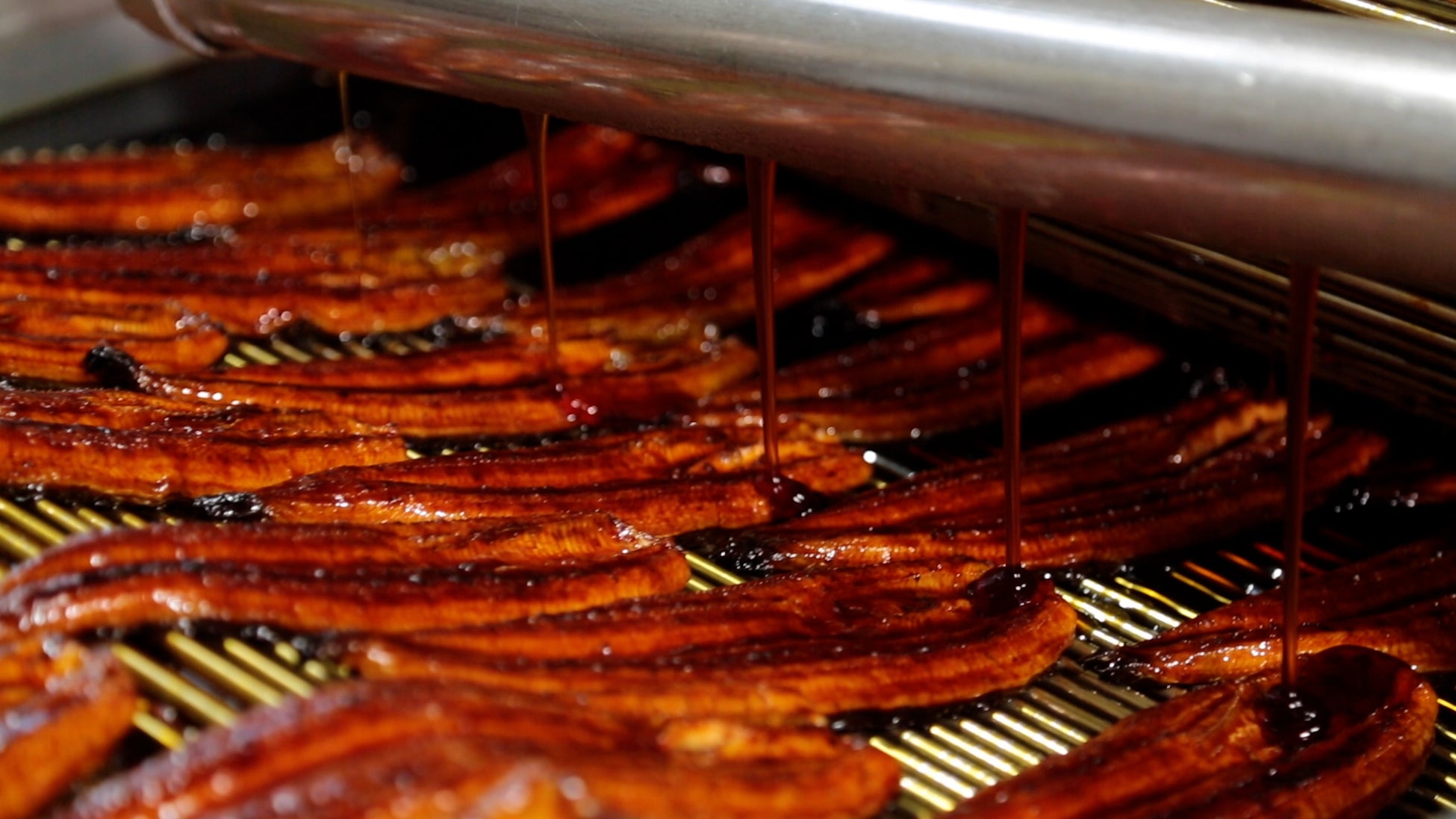 うなぎは、とにかくしっかりと焼いて、身の内側までしっかりと火を入れることで美味しい蒲焼となります。鰻楽では全長73mもの焼き工程ラインで炭火とガスバーナーの両方を使って丹念に焼き上げていきます。