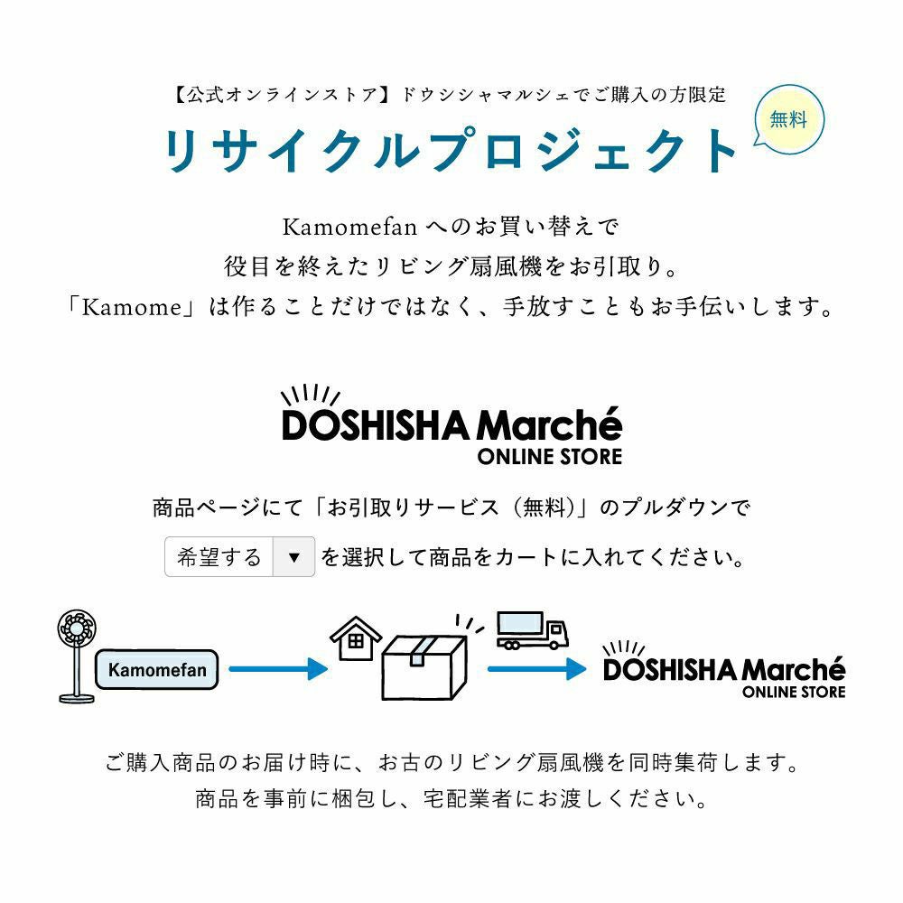 Kamomefanをご購入の際に引き取りをご希望のお客様へ、製品と同時にリサイクル用の送付状をお届けします。その送付状を使って、お客さまが不要となったリビング扇風機の「お古(他メーカー品含む)」を送ることができます。お預かりした「お古」は、さまざまな形でリサイクルされます。