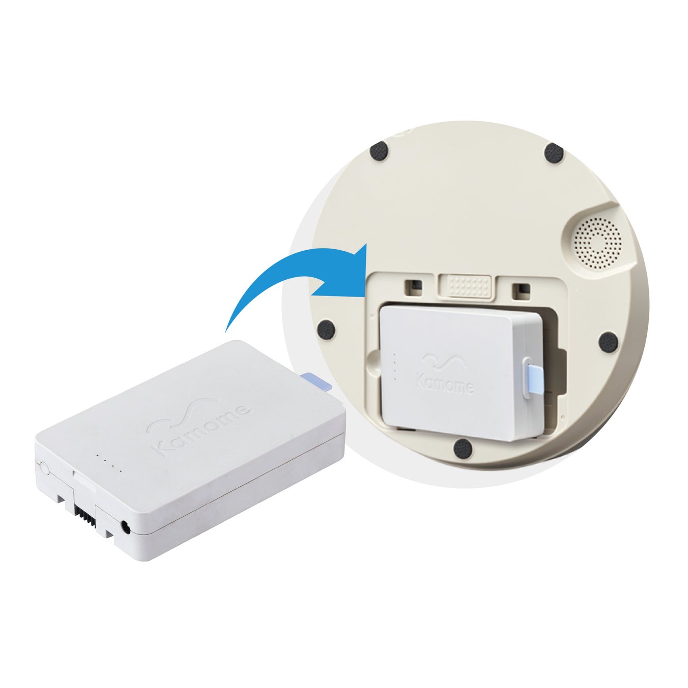 「Kamomefan+c living」と「Kamomefan+c lite」は、バッテリー変換機「Otomo Dock」と専用バッテリー「Genki Pack」を使えばコードレス稼働が可能です。12時間OFFにならないように設定した場合は「Kamomefan+c living」は24時間、「Kamomefan+c lite」では25時間駆動することができます。「Kamomefan+c move」は別売りの専用バッテリー、Genki Packを使用することでコードレスに使用できます。