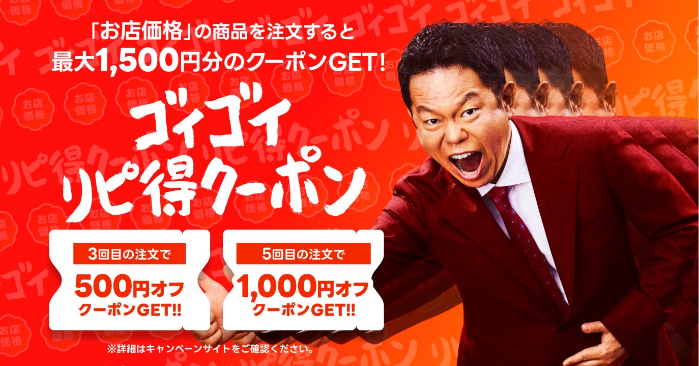 「超ゴイゴイヤスー祭」は、そのネーミングの通り、「ものすごい(ゴイゴイ)」と「安い(ヤスー)」という2つのメッセージを込めた出前館史上最大級のゴールデンウィークキャンペーンです。デリバリーを日常の選択肢として定着させるため、究極の利便性と驚きのおトクさをご提供します。