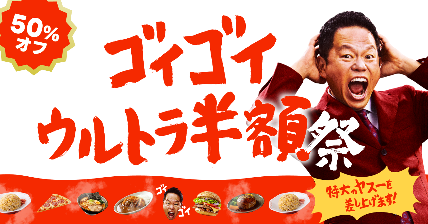 初めての開催となる「超ゴイゴイヤスー祭」では、ゴイゴイヤスーな4つの施策を通して、出前館史上最大級の熱量でゴールデンウィークの食卓をおトクに盛り上げてまいります。送料無料、ウルトラ半額祭、豪華クーポン、100円セールと、ヤスーが盛りだくさんな内容となっておりますので、ぜひこの機会に出前館をご利用ください。
