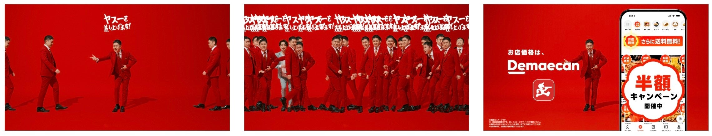 「超ゴイゴイヤスー祭」の圧倒的な安さを、ダイアン・津田さんの持ちネタである「スーを差し上げます」と絡めて「ヤスーを差し上げます」で、ダイアン・津田さんとドンデコルテ・渡辺さんが体現。画面一杯に増殖して伝える“ヤスー”が見どころです。
