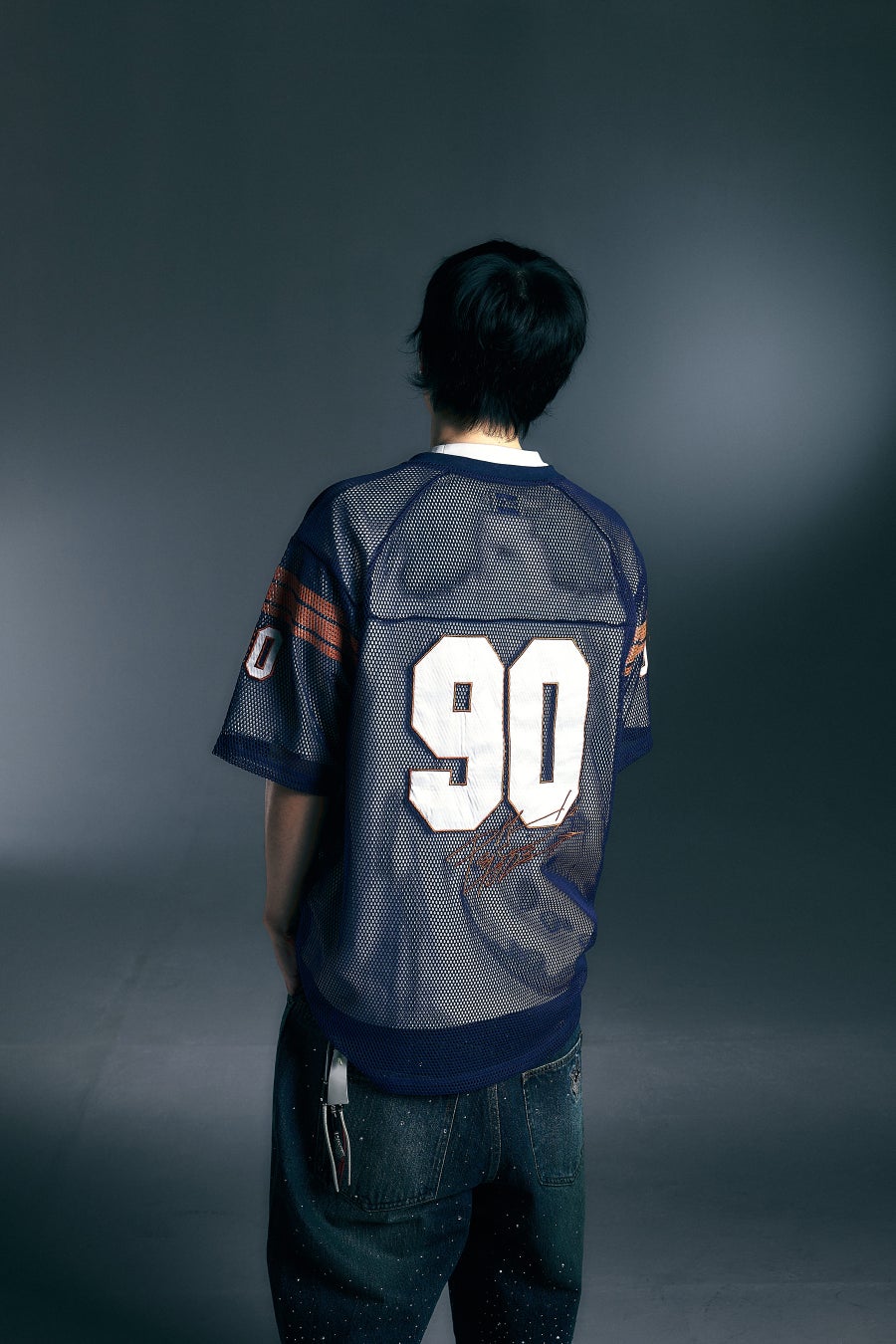 フロントには90のナンバリングが別生地で刺繍されており、バックには90のナンバリングとpH-1のサインが大胆に刺繍されているスポーティーな1着。