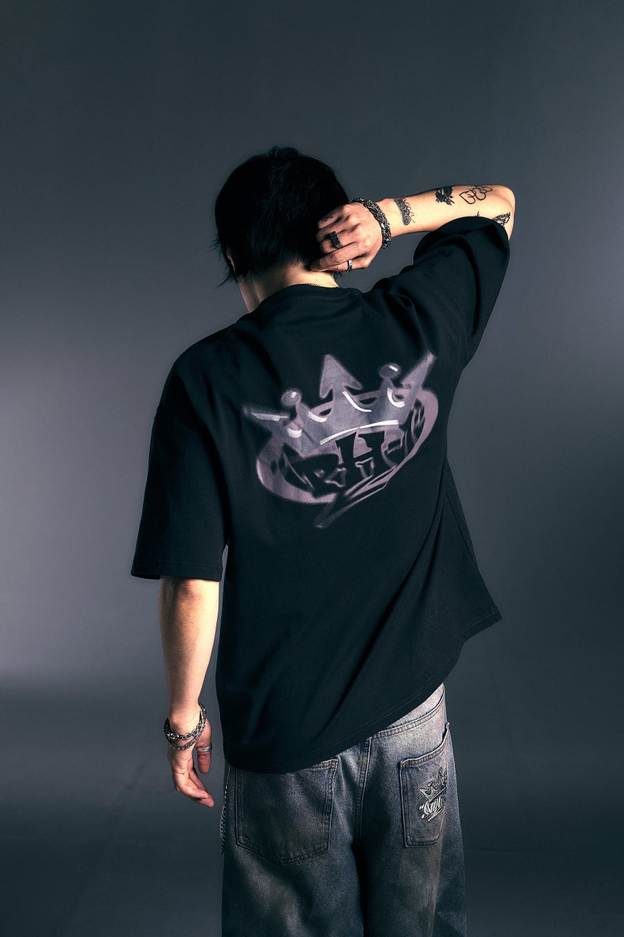 NINTYのタギングがpH-1になっているコラボロゴがフロントに刺繍されており、バックプリントには動きのあるKing LogoがプリントされているTシャツ。ボディは着丈が短めでオーバーすぎないサイズ感。