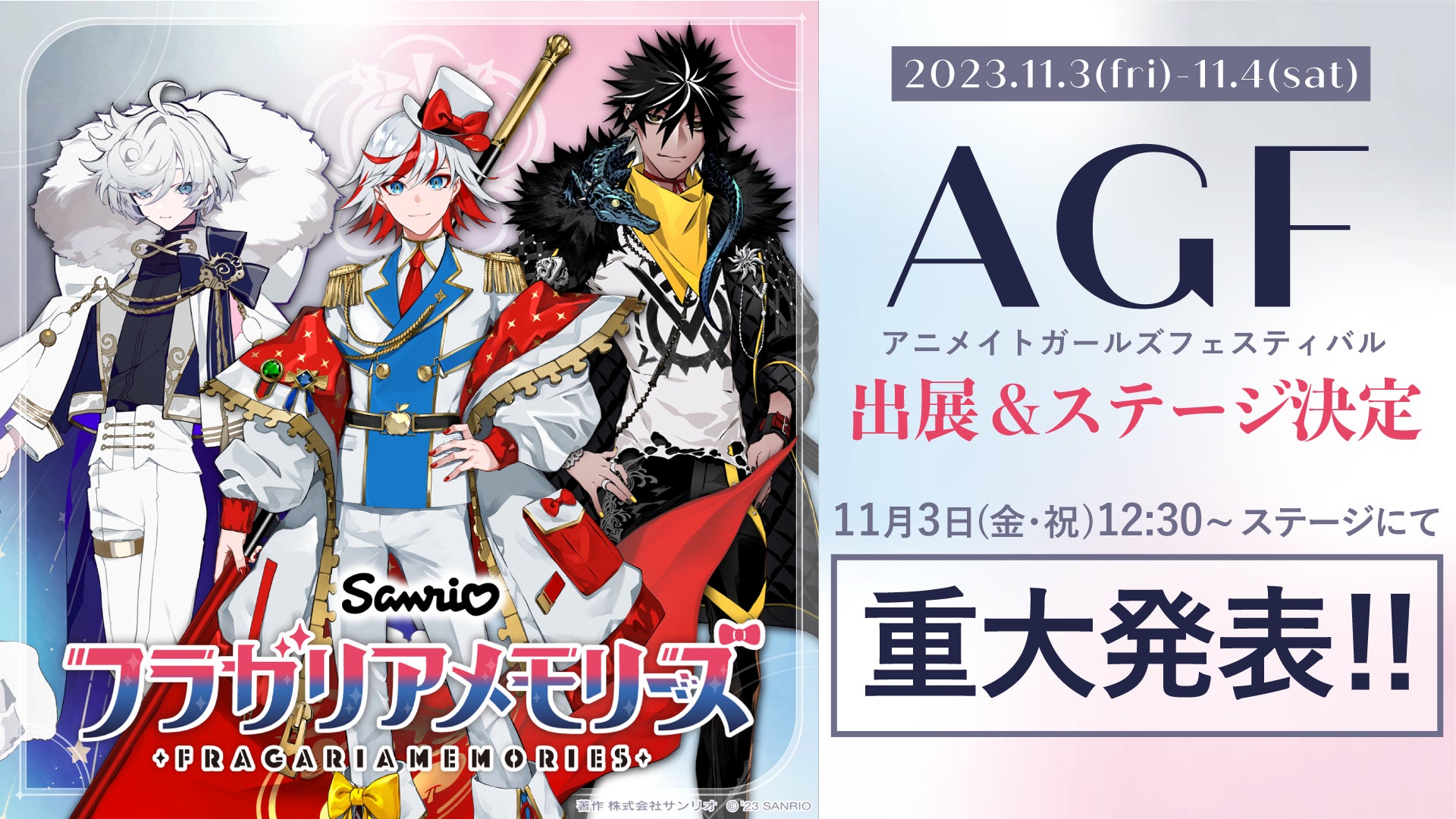 池袋・サンシャインシティで開催されるアニメイトガールズフェスティバル2023(略称:AGF2023)に「フラガリアメモリーズ」のブースを出展いたします。また、11月3日(金・祝)には、出展ステージに「フラガリアメモリーズ」のキャラクターのボイスを担当する声優が登場予定です。更に、当日は今後の展開にまつわる重大発表も予定しています。詳細は、後日「フラガリアメモリーズ」公式X(旧Twitter)にて発表いたします。