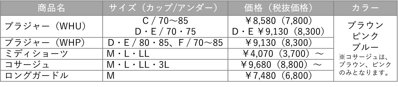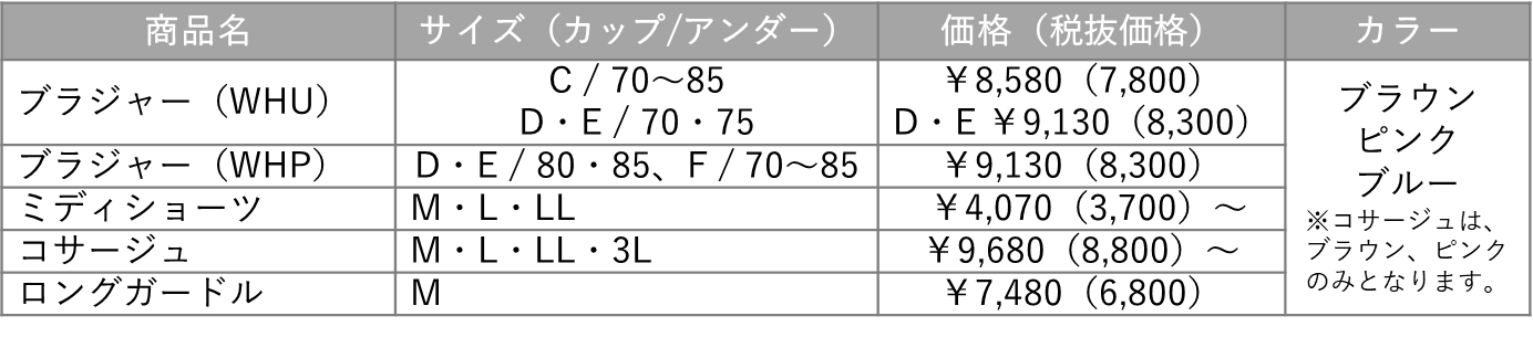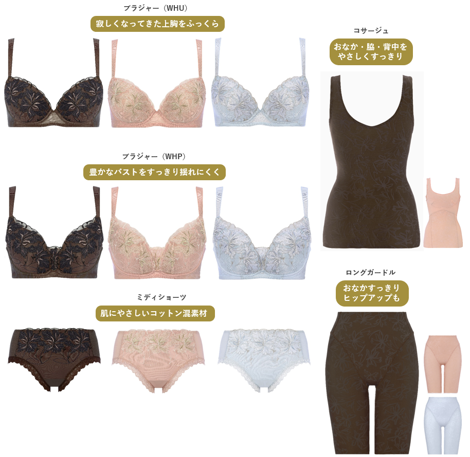 サイズダウンしたバストをサポートし、リフトアップするブラジャー(WHU)と、豊かなバストをすっきり整えるブラジャー(WHP)をご用意しています。