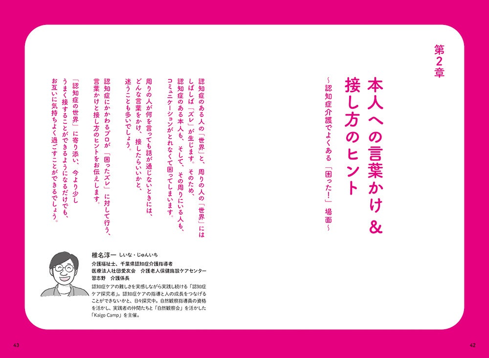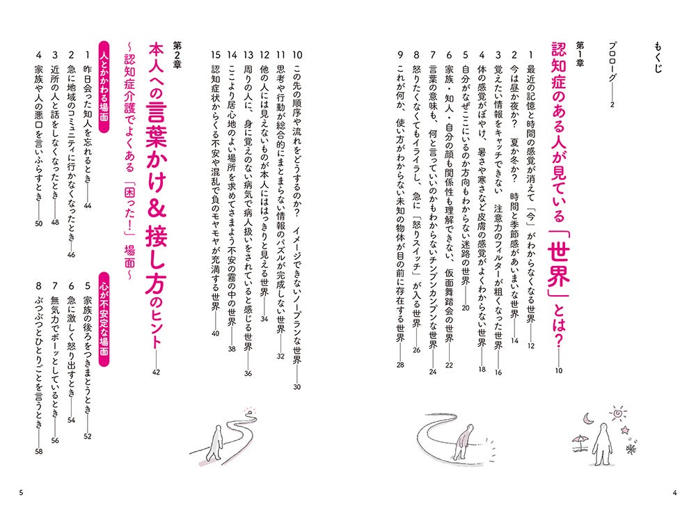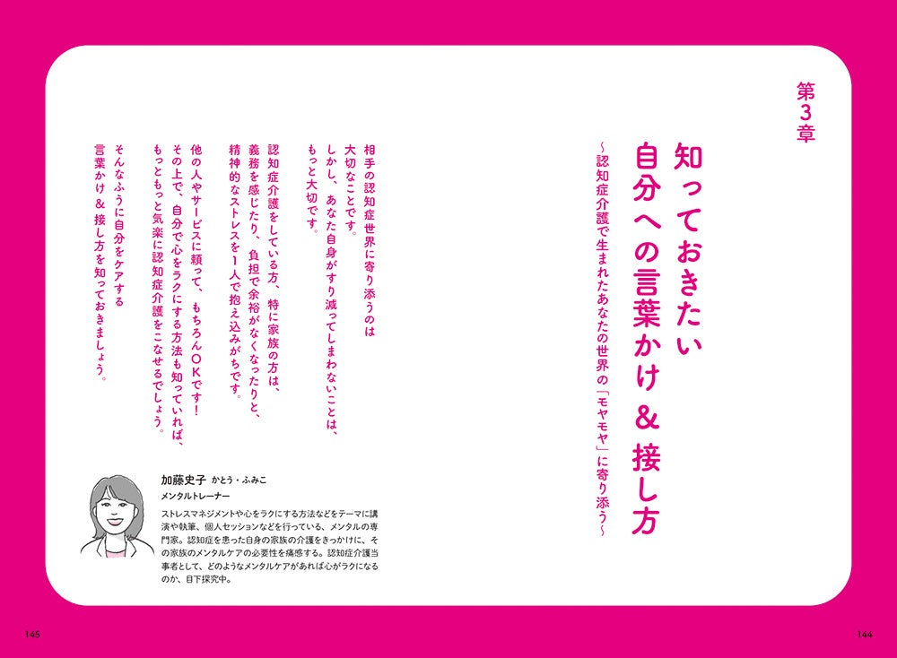 この本では、介護のプロとメンタルケアの専門家が、認知症の人も介護する人もお互い気持ちよく関わっていくための言葉かけと接し方をご紹介します。