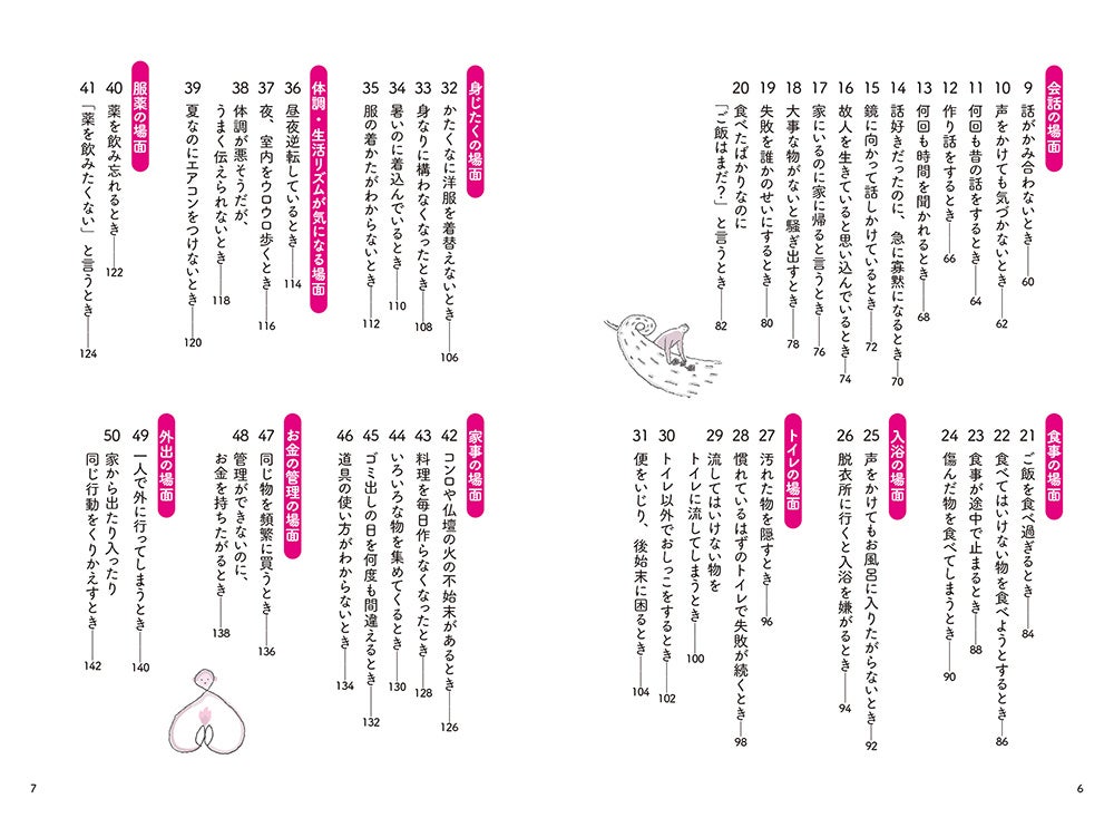 「同じものを頻繁に買ってしまう」「服が汚れているのに着替えてくれない」「大事なものが無くなったと騒ぐ」「昔の話を何回もする」……など、困った場面に寄りそう言葉かけや接し方がみつかります。