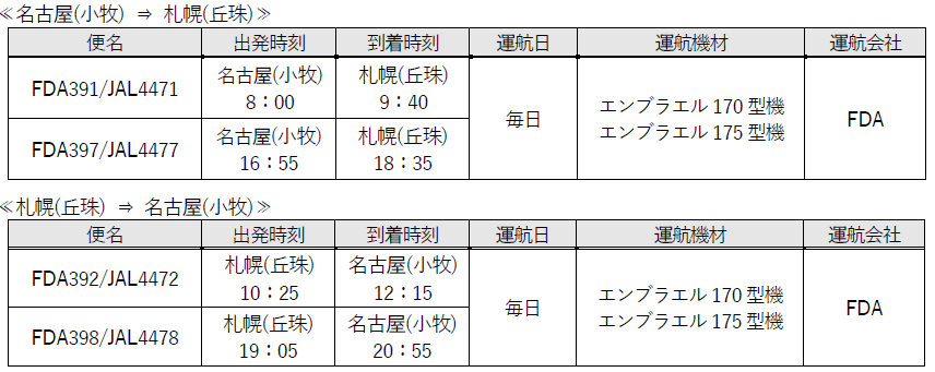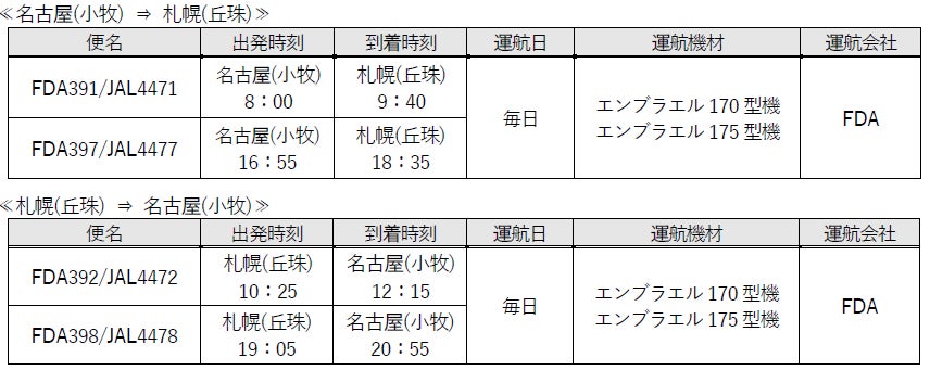 株式会社フジドリームエアラインズ(本社:静岡県静岡市、代表取締役社⻑:楠瀬 俊⼀、以下「FDA」)と日本航空株式会社(本社:東京都品川区、代表取締役社長:赤坂 祐二、以下「JAL」)は、2023年夏ダイヤ(2023年3月26日~10月28日)より、FDAが新たに就航する名古屋(小牧) = 札幌(丘珠)路線において、JALコードシェア便を設定します。