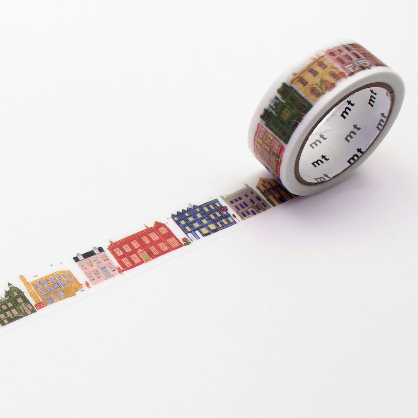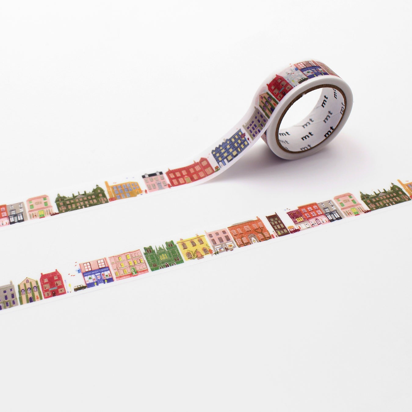 Pollyが描くお店やお家がずらりと並んだデザインのマスキングテープです。イギリスの雑誌『Homes & Antiques』の旅行特集で、ルートマップとして描かれた建物のイラストをもとにデザインしました。
