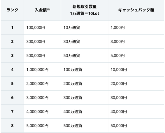 対象期間中にご入金とお取引を達成された方対象に最大1%をキャッシュバックいたします。