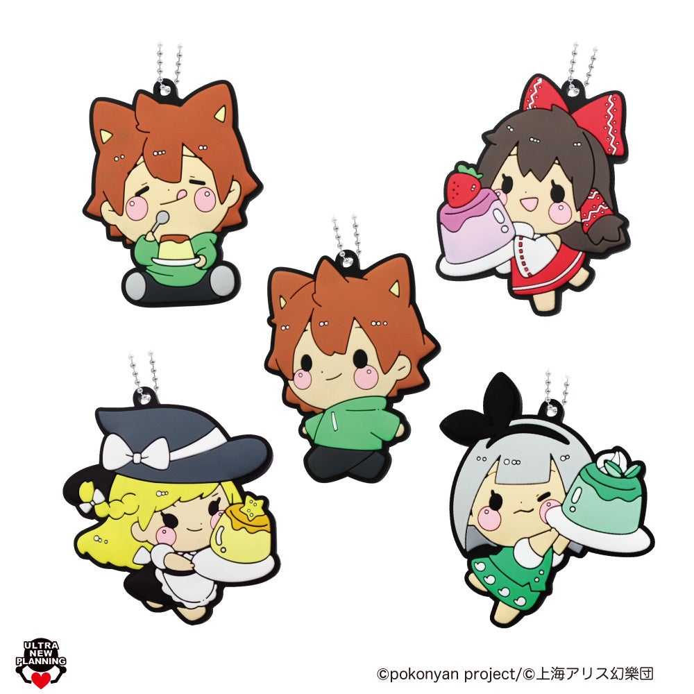 ぽこにゃんと東方Projectの博麗霊夢、霧雨魔理沙、魂魄妖夢の描き下ろしデザインのラバーマスコット。