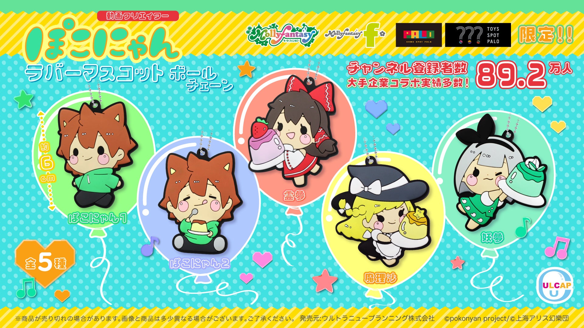『ぽこにゃん』と東方Project の博麗霊夢、霧雨魔理沙、魂魄妖夢が持った描き下ろしデザインで、全5種を展