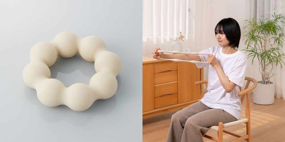 二の腕のトレーニングにおすすめなトレーニングチューブ。二の腕の外側、内側の両方にアプローチできます。ソフトな“ふわふわ”タイプでいつでも気軽に使え、ながらトレーニングにピッタリです。