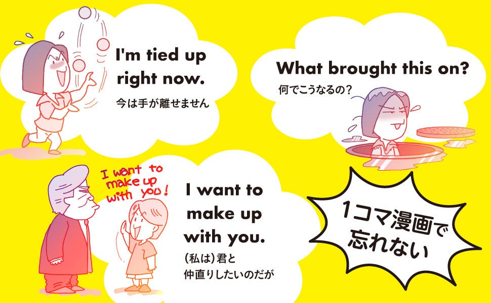 どんな会話のときに該当のフレーズを使うのかが、ひとコマ漫画でひと目でわかるように展開していきます。